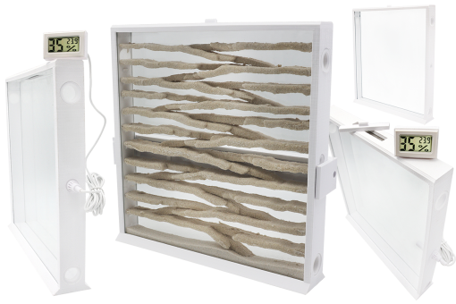 - **Festes & natürliches Inlay** Die Gänge sind fest definiert, sodass den Ameisen stets ausreichend Platz zur Verfügung steht und die Sicht nicht durch Verschmutzungen beeinträchtigt wird. Die Inlays sind fest mit Sand beschichtet auf natürliche Weise behandelt und können Feuchtigkeit effizient speichern.
